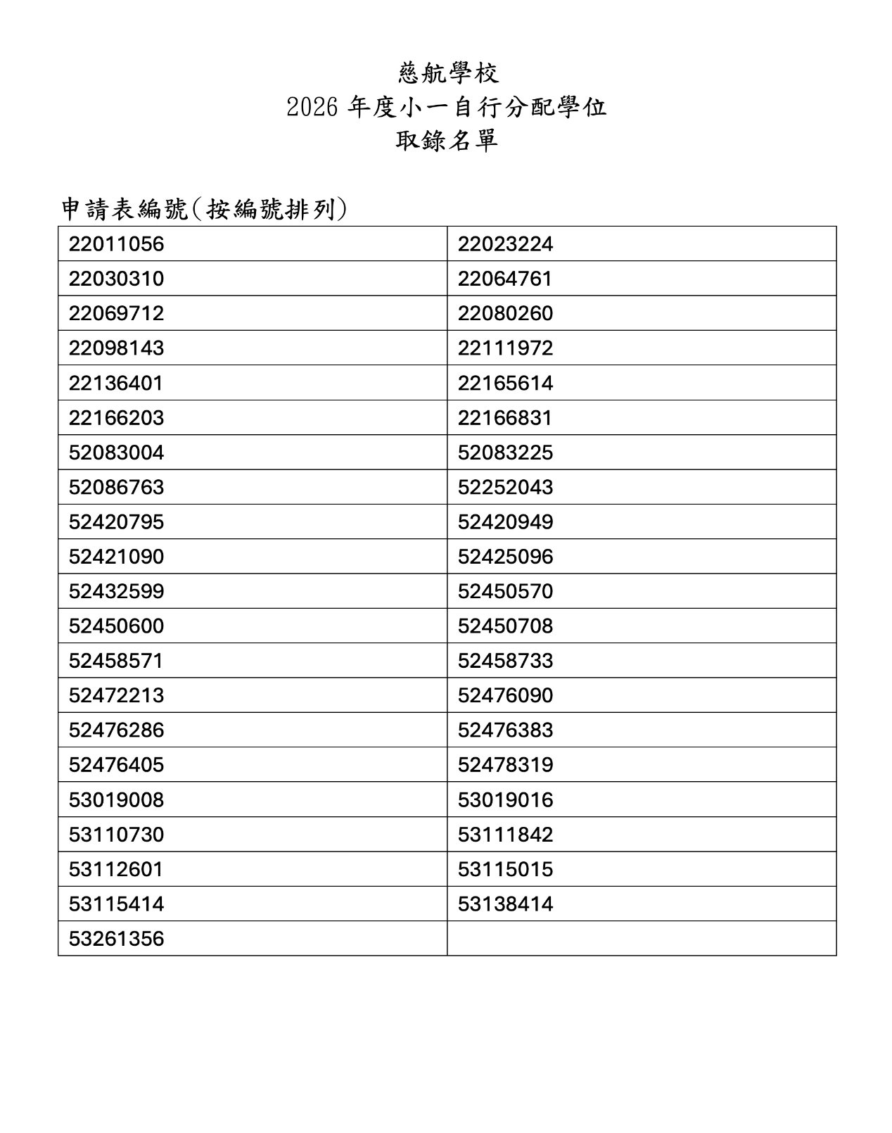 2026-2027年度「小一自行分配學位」取錄名單